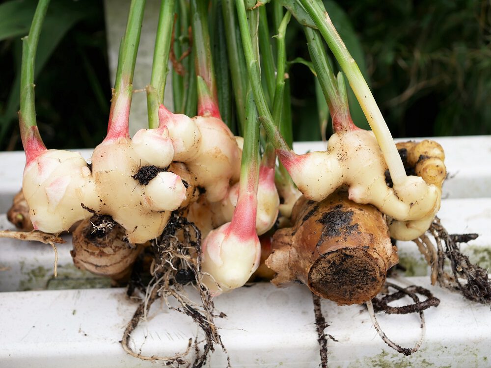 Ik dacht dat de groene stengel wellicht ook iets naar gember zou smaken maar die smaakt nergens naar en heb ik 3 centimeter boven de verse gemberwortels afgesneden. De volledige oogst zie je op de afbeelding bovenaan dit artikel.