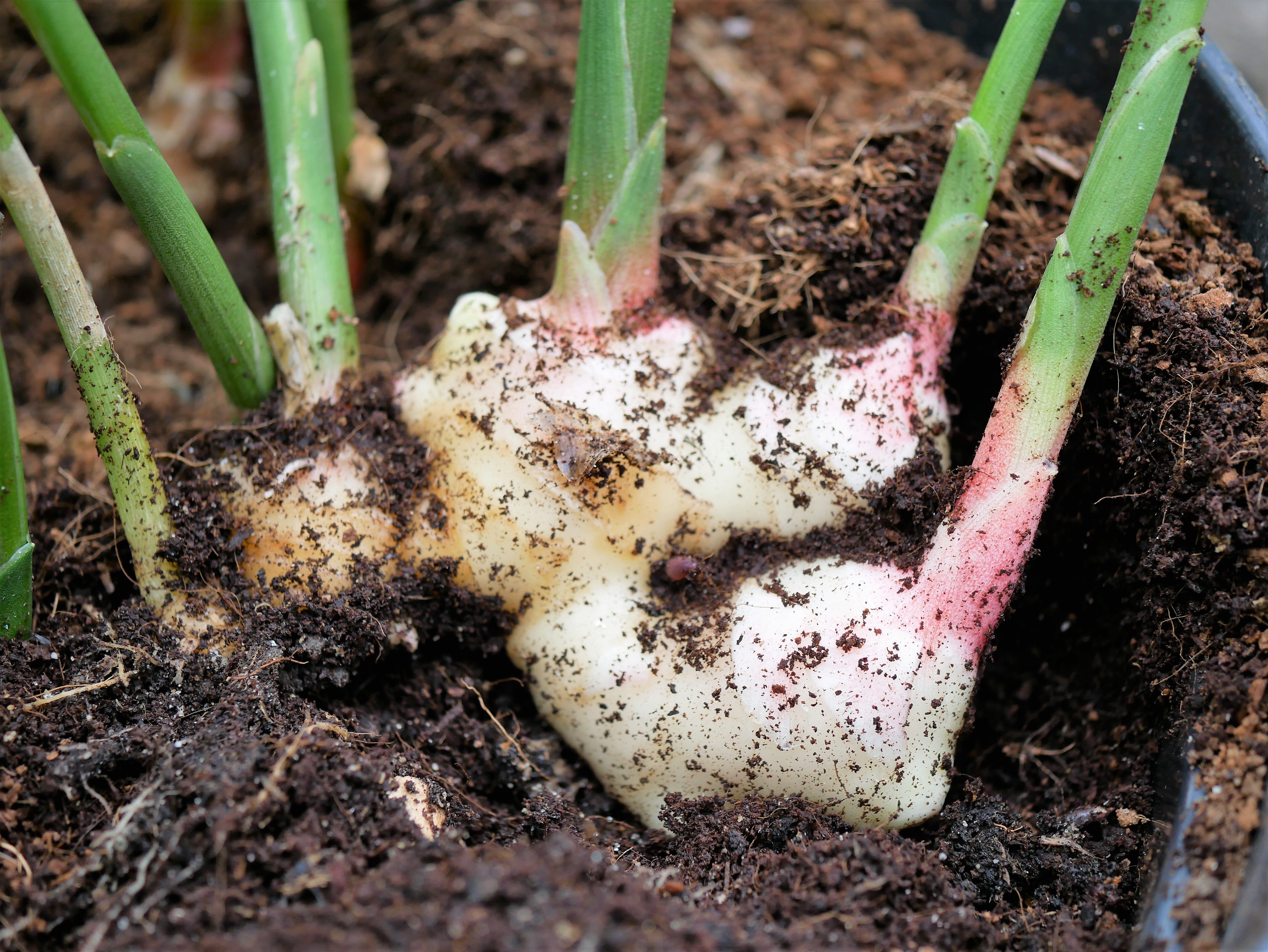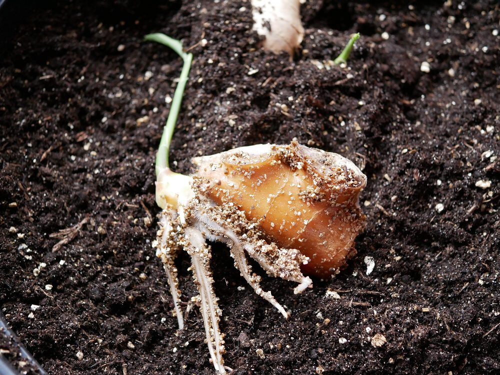 De vorige twee keren plantte ik de verse gemberwortel in een pot met potgrond. Dit jaar heb ik de gemberwortel eerst laten spruiten. Dit (b)lijkt vooralsnog essentieel, pas als de gember groene stelen krijgt gaat ze onder de knol ook worteltjes maken. Dat laten spruiten kan op een bordje in een laagje water, vergeet dan niet om regelmatig water bij te vullen.