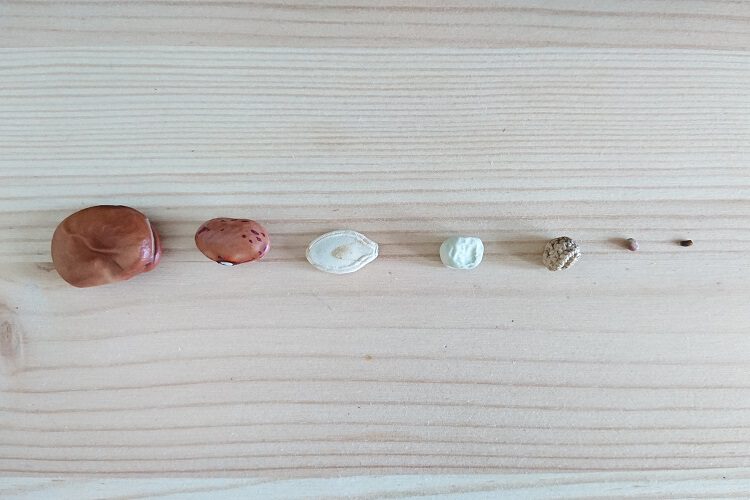 Zaadjes van de foto hierboven van links naar rechts: Tuinboon, Borlottiboon, Courgette, Doperwt, Oost Indische kers, Radijs, Witlof