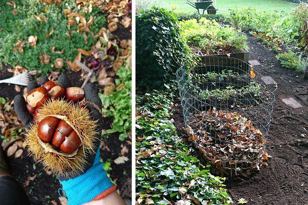 Ik ruim de (uit de bomen gevallen) bladeren iedere week op. Ik gooi dit blad niet weg, maar verzamel het op één plek. Deze doe ik in een hele grote ovalen korf, waarin alle beestjes kunnen overwinteren. Je kunt het blad ook bewaren voor bladcompost, maar zorg dan wel dat er niks anders tussenzit dan blad. Er mogen dan dus geen bolsters van tamme kastanjes bij zitten, zoals bij mij het geval is. Het is heel veel werk om al deze bolsters tussen de bladmassa uit te vissen, dus dat ga ik niet doen. Laat jij alles liggen? Dit is natuurlijk ook een optie en ik moet zeggen dat ik dit het eerste jaar ook heb gedaan. Ik merkte alleen wel dat er veel groen ontstond in mijn tuin dat ik er niet wilde hebben. Doordat ik de bladeren verplaats naar een andere plek waar ook de beestjes lekker hun plekje kunnen vinden, ben ik blij en zijn de beestjes blij :).