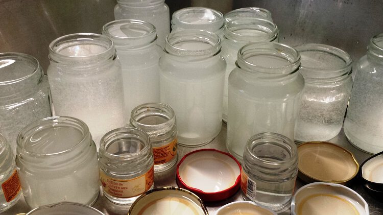 Laat dit een half uurtje op zacht vuur pruttelen. Maak ondertussen de potjes en deksels schoondoor ze eerst goed af te wassen en vervolgens met soda en kokend water om te spoelen. Spoel de potjes na met kokendheet water en laat dit water tot de rand in de potjes en deksels staan tot je de potjes gaat vullen.