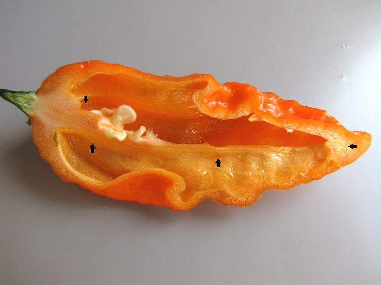 Er wordt trouwens vaak gedacht dat in de zaden van pepers de meeste heetheid zit, en dat is pertinent niet waar (volgens het ‘Chile pepper institute’ aan de ‘University New Mexico’). De hoogste concentratie capsicaïne (de olieachtige stof die een peper zo heet maakt) zit in de zaadlijsten, even aangegeven met pijltjes hieronder.