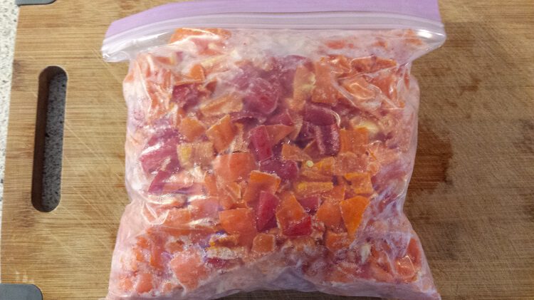 Ik vries de pepers altijd ‘schoon’ in; gewassen, opengesneden, zaden en zaadlijsten eruit en in stukjes gesneden. Ik vind zaden niet lekker, sommige mensen laten de zaadjes erin zitten maar ze blijven ook na het koken nog hard en ze hebben ook iets bitters.