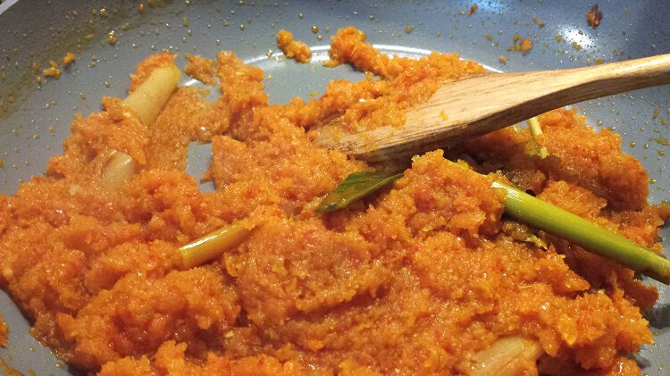 Maal de peperstukjes heel fijn in de keukenmachine (of anders met de hand in een vijzel). Verhit de olie in een hapjespan of koekenpan en bak de gemalen pepers op zacht vuur ongeveer 5 tot 7 minuten. Hak ondertussen in de keukenmachine de knoflook, ui en verse gember fijn. En voeg dit toe aan het pepermengsel in de pan. Geef een flinke mep met bijvoorbeeld de achterkant van een mes op de stukjes sereh en voeg toe aan het pepermengsel in de pan. Leg ook de blaadjes djeruk purut erbij, en de fijne rasp van de limoen.