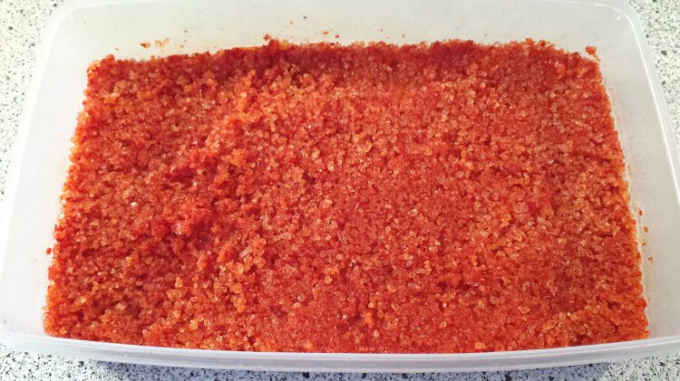 De andere sambal, Sambal Limoen, is bijna oranjerood en zeer heet (met dank aan alle Habanero’s die in deze pepermix zaten). En daarnaast is ze lekker fris en zuiver van smaak.
