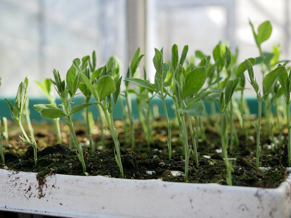 Ik zaai zelf 1 zaadje per vakje in een tray, dan kan ik de plugjes met zaailingen later gemakkelijk bij een klimrek uitplanten, ik hou dan een afstand van ongeveer 8 centimeter aan. Houd uitgeplante zaailingen wel in de gaten en bescherm ze wanneer nodig. Hier bevestigen we een stuk vliesdoek of fijnmazig gaas over de zaailingen tegen vogelvraat. Als de zaailingen ongeveer 25 centimeter hoog zijn vinden de vogels ze niet lekker meer en kan de bescherming worden weggehaald. Dat is gelijk een mooi moment om de zaailingen te toppen. Door de top eruit te knippen zorg je ervoor dat de zaailing zich zal gaan vertakken en dat levert dus extra bloeistengels op.