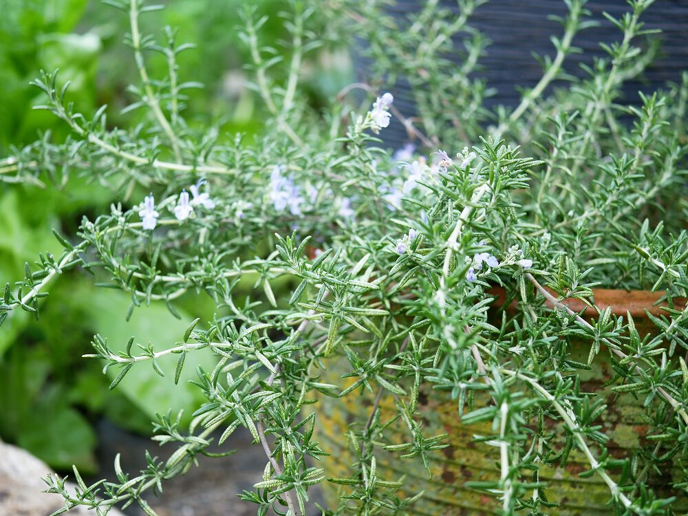 Dit is een bekend Mediterraan keukenkruid. De kleine groene naaldjes van deze heesters hebben een uitgesproken warme kruidige geur. Ze bloeit vaak al in het voorjaar met heel kleine witte, zachtroze, lila of lilapaarse eetbare bloempjes. Rozemarijn kan wel 60 tot 100 centimeter hoog worden, maar er is ook een liggende/hangende variant die je vaak onder de naam Prostratus ziet (die laatste is helaas iets minder winterhard dan de opgaande vorm, maar doet het hier in pot met overwintering in de koude kas prima).