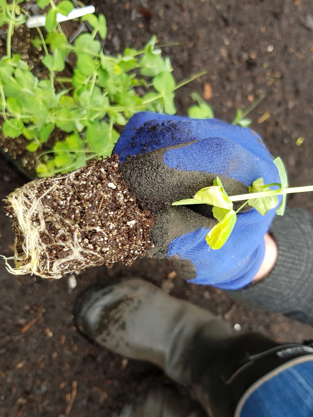 Het rekwerk staat en nu is het tijd om de plantjes in de grond te zetten. Haal de kleine plantjes uit hun potje en zet ze voorzichtig in de grond. Houd ongeveer 20 cm afstand tot het volgende plantje. Je kunt aan beide kanten van het rekwerk plantjes uitplanten. Doe dit dan om en om, dan hebben ze allemaal voldoende ruimte om te groeien en te klimmen. Plant ze iets dieper in de grond dan dat ze in het oorspronkelijke potje zaten. Op deze manier zullen de plantjes wat dieper wortelen en sterker worden. Hierna volgt het allerbelangrijkste, namelijk het water geven met een gieter met broeskop!!