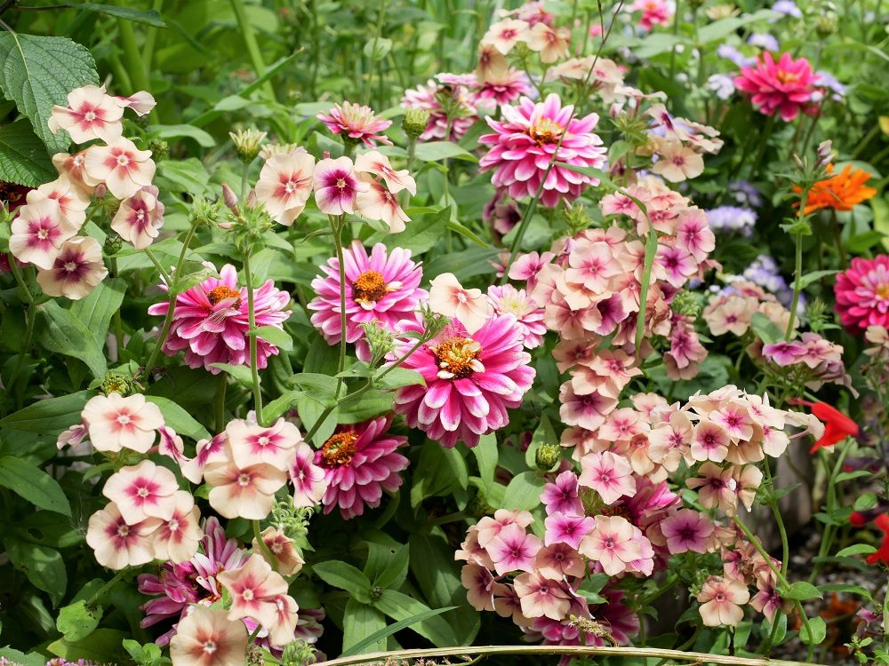Op de foto bovenaan dit blog zie je nog 2 favorieten van dit jaar: Zinnia marylandica (Zahara Double Raspberry Ripple), een Zinnia die, in tegenstelling tot Zinnia elegans, laag en compact blijft maar wel net zo lang en rijk bloeit. En erdoorheen geweven zie je Phlox drummondii Cherry Caramel, ook een mooie plant met bloemen in schermen die veel bestuivers lokt en ook als plukbloem gebruikt kan worden. Door de droogte en hitte duurde de bloei dit jaar wat korter (tot half augustus) maar ik heb andere rassen in andere jaren wel tot in september zien bloeien.