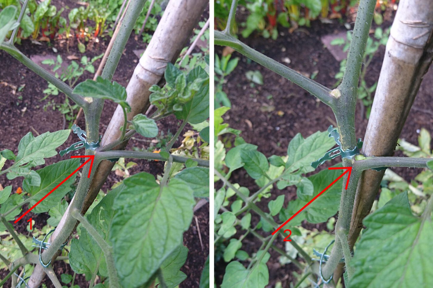 1. Op deze foto zie je de dief in de oksel van de hoofdstam en de vertakking zitten. Als je deze dief laat zitten komt hier eigenlijk weer een extra hoofdstam aan. Laat hem een keertje zitten dan weet je meteen hoe deze eruit ziet. Maar haal hem later wel echt weg.