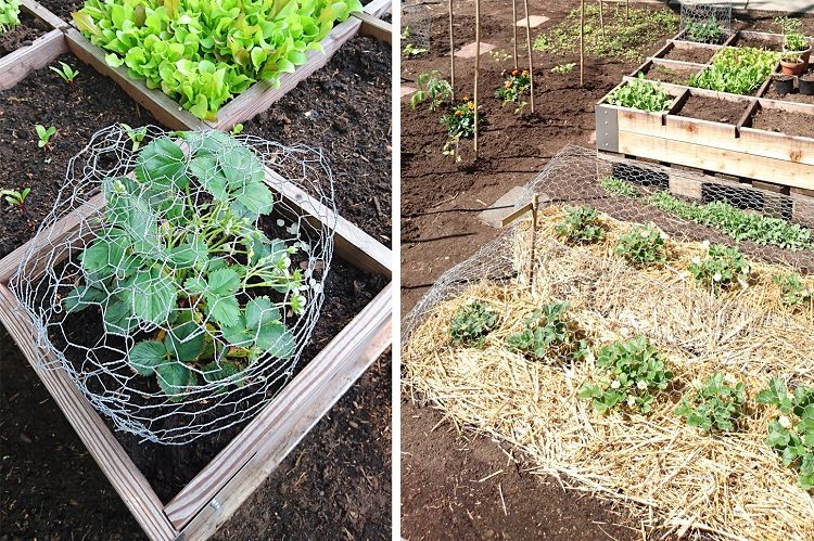 Ook slim om de bodem van de aardbeien te bedekken met stro. De aardbeien worden zwaar als ze gaan groeien en gaan op de grond liggen. Als je tussen de aardbeien en de grond niets legt rotten ze weg en dat zou toch zonde zijn. Bedek de grond dus met een dikke laag stro, zodat ze een zacht bedje hebben waar ze groot en rood kunnen worden. Als je de stro niet dik genoeg neerlegt, dunnetjes op zo’n manier dat je de bodem nog ziet, gaat het zaad wat tussen het stro zit schieten, en heb je dus heel snel veel onkruid. Bekleed de bodem dus met een dikke laag.
