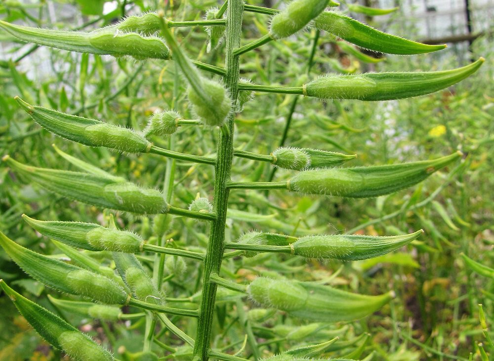 Na de bloei verschijnen de zaadpeultjes (hauwtjes), maar deze zijn niet stekelig, ze zijn ook kleiner en staan wat schuiner langs de stelen (je kunt dat zelfs op de foto al zien). Als de zaden rijp zijn kun je ze heel gemakkelijk oogsten door ze tussen je vingers uit de zachte en brosse hoesjes te wrijven. Ook nu zeef je de zaden, was ze daarna en laat ze nog een paar dagen drogen.