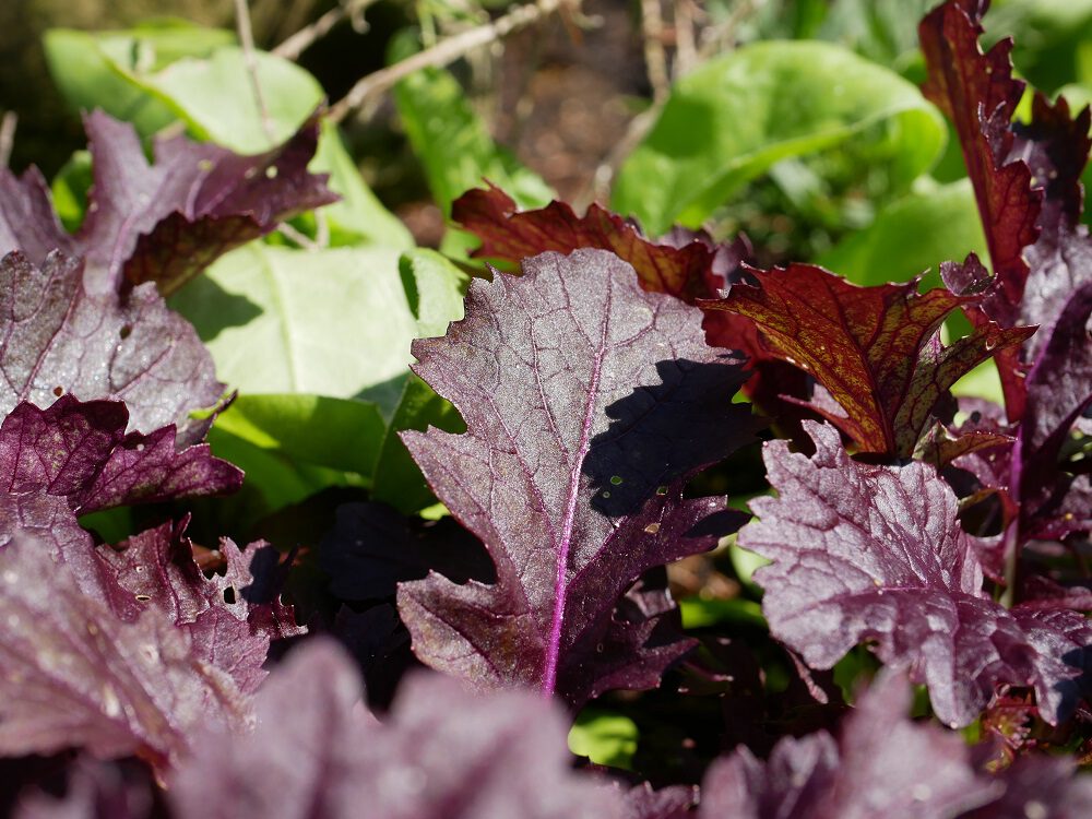 Op de laatste foto zie je nog een keer mosterdblad, het ras Crimson. Het pittige blad kun je ook prima stoven (zoals amsoi, wat uiteindelijk ook een mosterdblad is) maar ik vind deze daar eigenlijk te mooi voor en gebruik dit soort lekkere frisse en pittige blaadjes liever in salades, op een broodje gezond, etc..