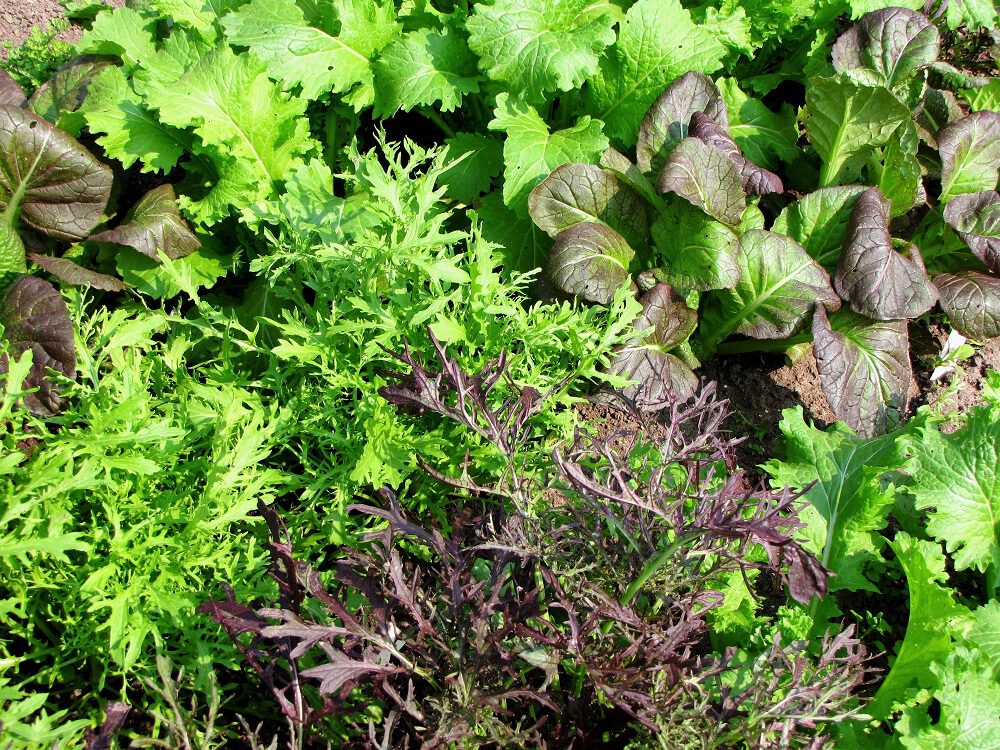 Op deze foto zie je een mengsel van mosterdbladplanten, er is veel verschil in kleur en bladvorm.