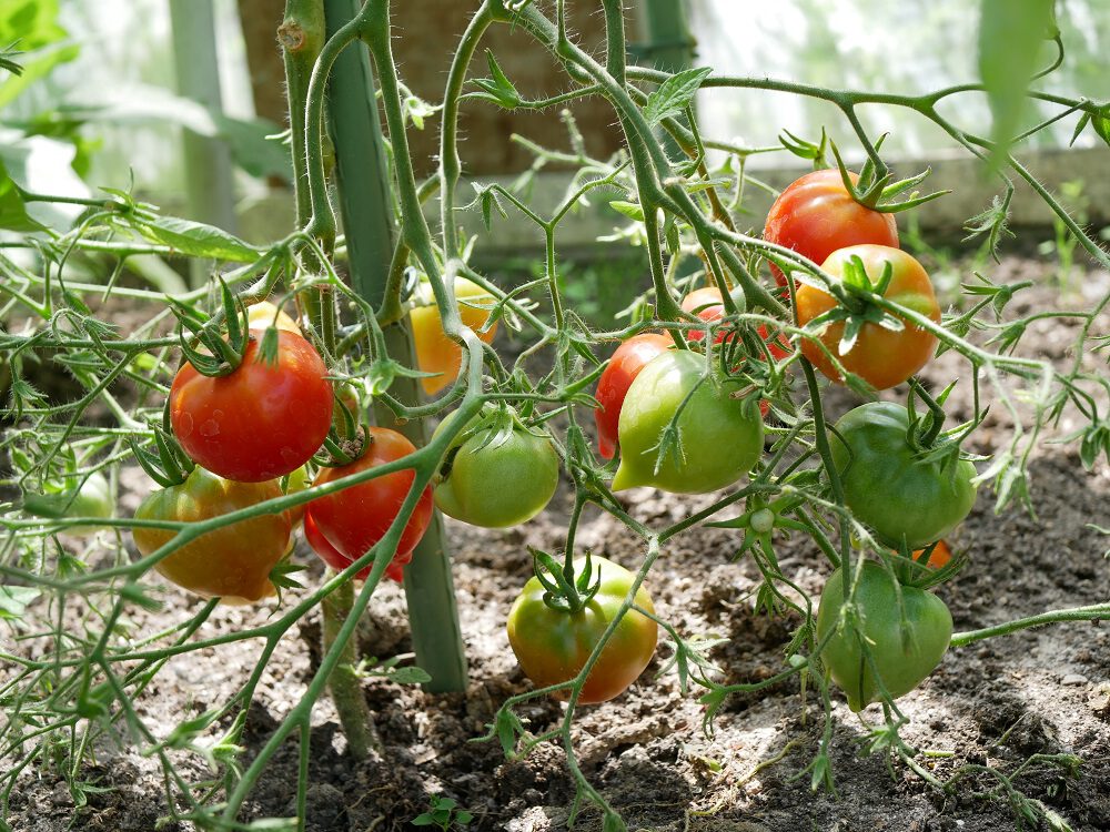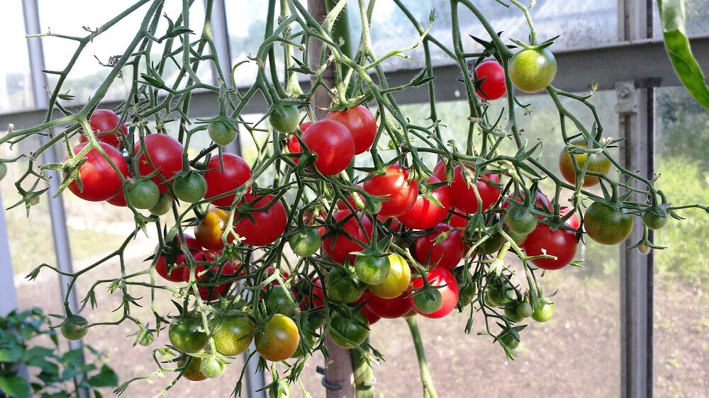 Nog één tip: de onderste tros kan zo zwaar zijn dat die op de grond hangt, met daardoor kans op het schimmelen van vruchten. Het is handig om onder de plant wat stro te draperen zodat de tomaatjes droog blijven. Of zet een krukje (of emmer ondersteboven) naast de plant zodat die onderste tros op een ondergrond kan rusten.