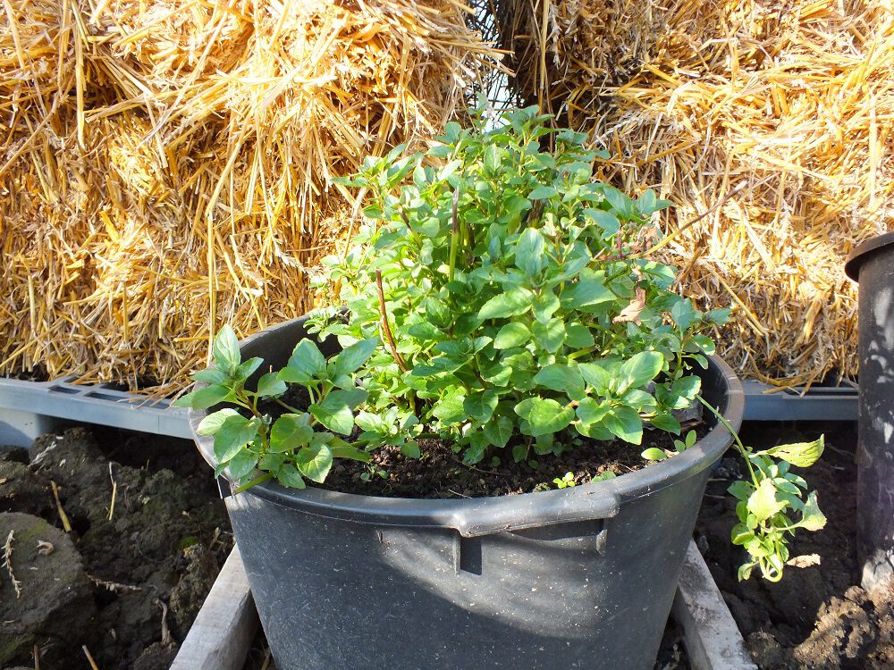 Hier ben ik blij met mijn munt in een klein formaat speciekuip: die is groot genoeg voor veel oogst, de pot loopt niet taps toe en is niet heel diep. Als het vriest kan ik de pot tegen het huis aan schuiven (is net iets minder koud). En als het streng vriest kan ik er voor de nacht een vliesdoek over draperen. Eventueel leg ik wat stro op de plant/grond in de pot, als isolatie.
