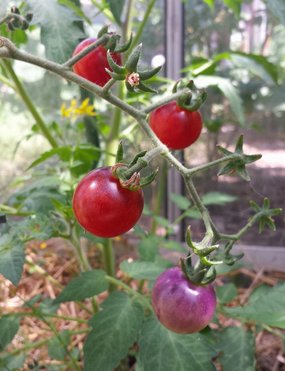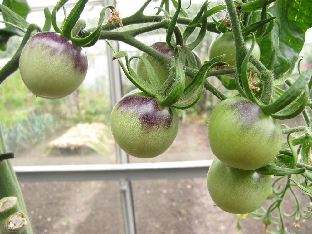 Dit is de tomaat Blueberry, de allereerste blauwe tomaat die ik teelde, in 2011. Je kunt op deze foto zien dat de tomaat groen begint, en dan langzaam vanaf de schouders steeds blauwer wordt. Rijp zien deze tomaten er trouwens zo uit: