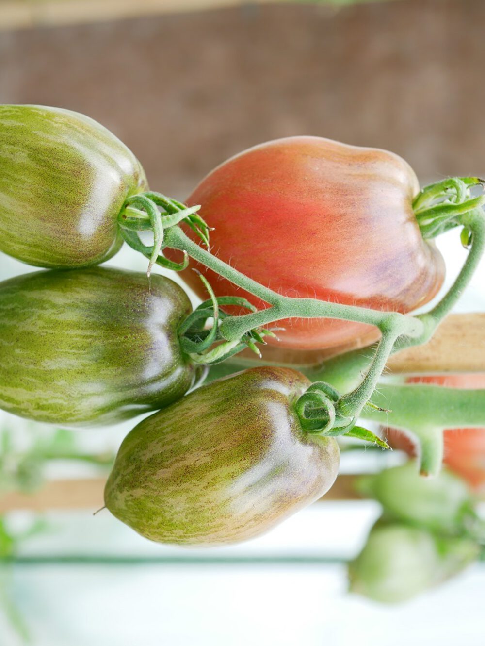 En tot slot nog zo’n nieuw ras; Streak Lightning, bijna roma-achtig van vorm, groen, met wat roze en paars en streepjes, groot, lekker fris van smaak, sappig (sappiger dan de gemiddelde roma), en zeker ook een welkome aanvulling in het grote aanbod van tomatenrassen.