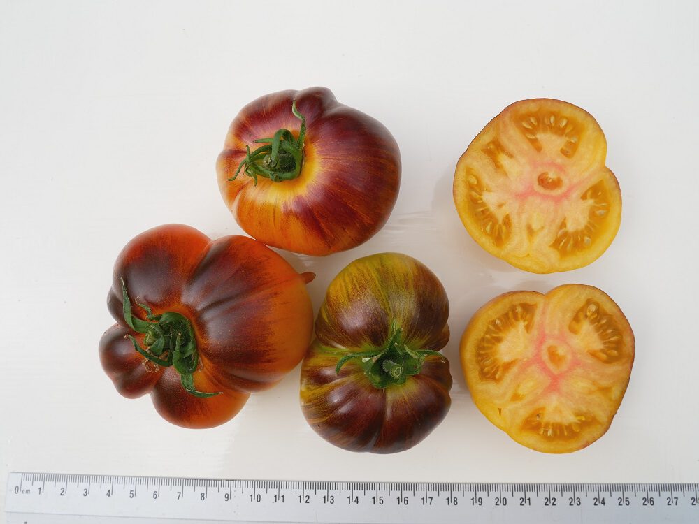 Alice Dream. Een vleestomaat, soms wat meer geel, soms wat meer groen, maar altijd met streepjes, en wat ‘blauw’ op de schouders, van binnen vaak gemarmerd. Nog niet helemaal stabiel, dat kun je zien aan de verschillen in kleur, vorm en tekening. Maar wel erg mooi. En lekker; zoet, sappig, vlezig en met een fruitige tomatensmaak.