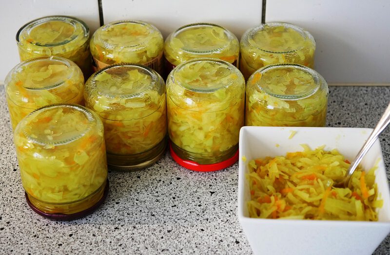 Op deze foto zie je inmaak die ondersteboven af staat te koelen. In dit geval is het Atjar, een soort zoetzuur, met in dit geval spitskool worteltjes, uien en koolrabi, maar je kunt er ook andere oogst voor gebruiken, zoals witte kool,paprikastukjes, komkommer, etc..