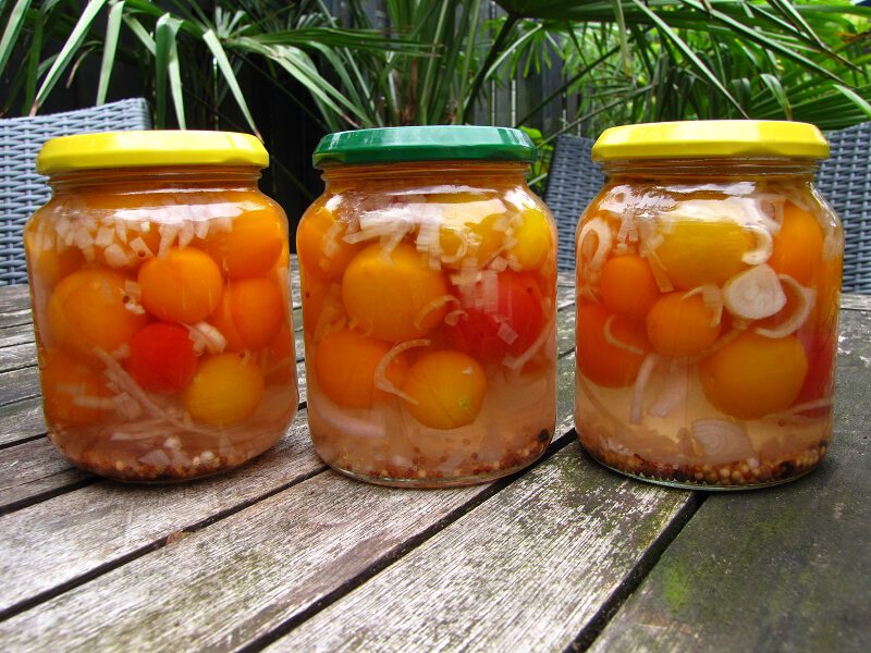 Op deze foto zie je cherrytomaatjes in zoetzuur, een goede en lekkere manier om nog wat langer van je zelfgeoogste tomaatjes te genieten!