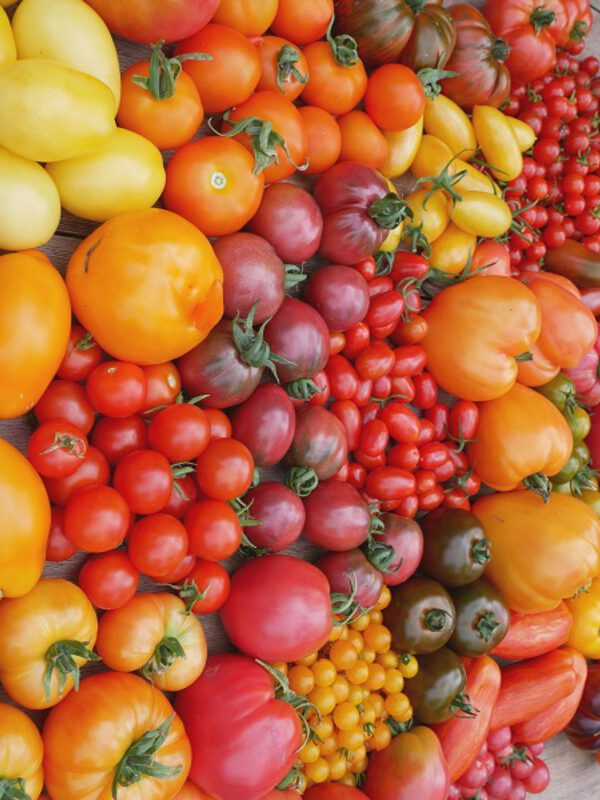 Op deze foto zie je de oogst van tomaten van deze week. Ondertussen hebben we al emmers tomaten geoogst, heel veel meer dan we kunnen opeten, weggeven en invriezen.