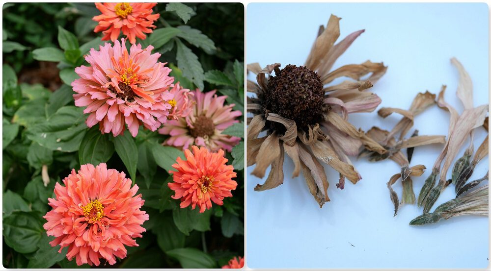 Zinnia. Laat een bloem volledig uitbloeien tot die droog en dor is. Trek voorzichtig de verdorde bloemblaadjes uit de bloem, het grijze zaadje zit onderaan een bloemblaadje en lijkt wel wat op de punt van een kroontjespen.