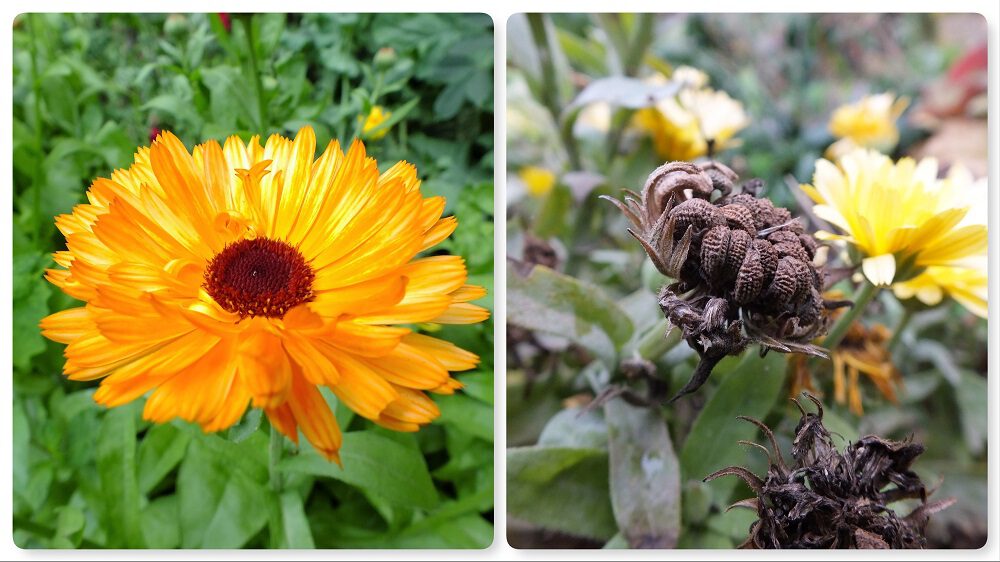Calendula officinalis = goudsbloem. De zaden zijn onregelmatig gevormde bobbelige halvemaantjes. Wacht tot de zaden volledig dor en droog zijn voor je ze oogst.