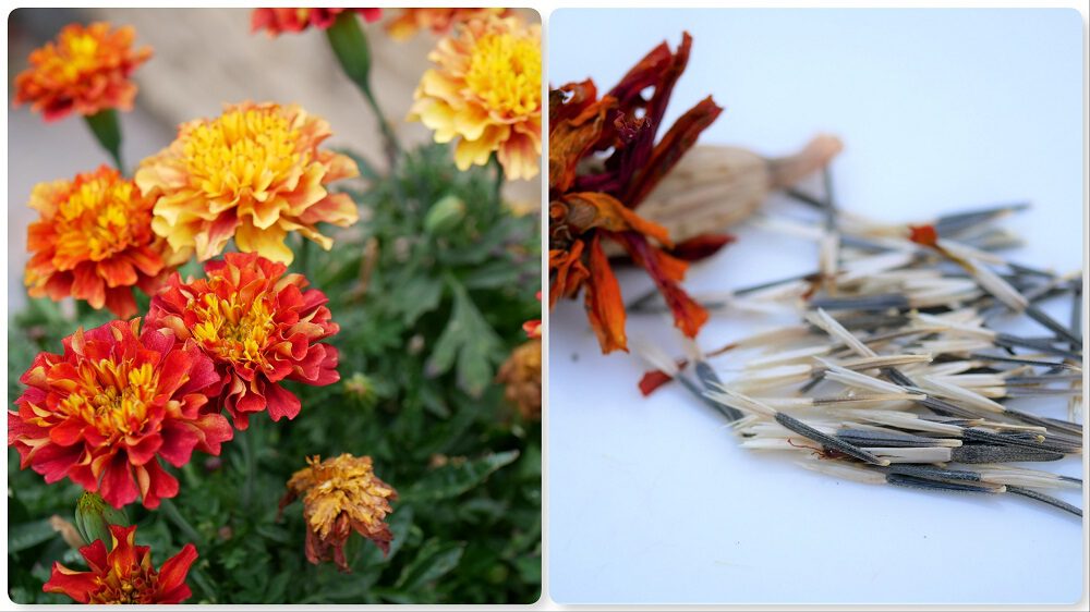 Tagetes = afrikaantje. Elke uitgebloeide en verdorde bloem heeft een hoesje met daarin flink wat zaden onder zich. Het zijn ongeveer 2 centimeter lange stokjes die half beige en half leisteengrijs van kleur zijn. Elke bloem heeft dus veel zaden.