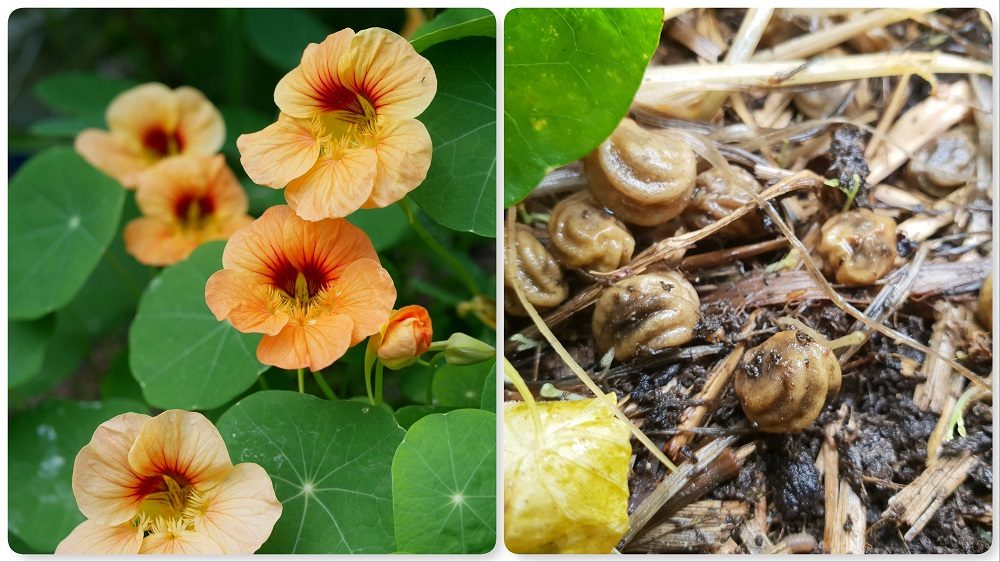 Tropaeolum = Oost-Indische kers. Het beste is om de zaden niet te oogsten (want dan zijn ze nog onrijp), maar gewoon te wachten tot de nazomer/herfst. Je kunt dan makkelijk op de grond de rijpe en afgevallen zaden vinden. Laat de hoesjes met zaden zeker nog 2 weken drogen; omdat het echte zaadje binnenin het hoesje zit duurt het wat langer voor de zaden volledig gedroogd zijn voor bewaring.