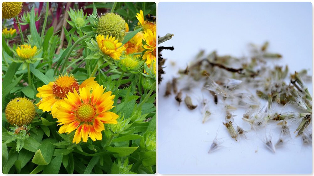 Gaillardia = kokardebloem. Deze zaden zijn moeilijk te fotograferen; het zijn kleine witte papierachtige ‘parapluutjes’ met wat ‘stekeltjes’ eraan (die stekeltjes hebben als doel om makkelijk aan kleding of dieren te kunnen ‘plakken’ tot de zaden ergens kunnen vallen en de planten zich zo verspreiden).