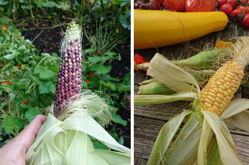 Zelf vond ik het in het begin erg lastig om te zien wanneer maïs precies te oogsten is. Dit zie je aan de draden die als het ware een soort kapseltje vormen bovenop de maïskolf. Als deze draden bruin/zwart geworden zijn en de kolf stevig aanvoelt, kun je hem oogsten. De kolven moet je na het oogsten eigenlijk meteen bereiden. Mocht je ze ’s ochtends oogsten, dan kun je ze het beste koel in de koelkast bewaren. Mochten de kolven niet goed gevuld zijn, dan heeft dit te maken met een slechte bevruchting of te veel of te weinig water. Helaas had ik hier last van, dus dat is weer een les voor het volgende seizoen.