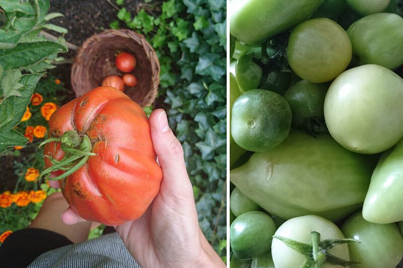 Veel tomaten zijn nog groen en doen hun best om rood te worden door de natuurlijke zon. Helaas wordt het aantal zonuren veel minder en is de kans groot dat veel tomaten buiten niet meer rood gaan worden. De kans op ziektes met kouder en natter weer is ook veel groter, dus breng dan de vruchten, ook al zijn ze groen, uit voorzorg in veiligheid. De groene tomaten kun je namelijk ook gewoon eten. Je kunt ze niet rauw eten, dus je moet ze wel eerst koken. Deze tomaten zijn heerlijk om chutney mee te maken. Vind hier mijn blog die ik vorig jaar schreef over het maken van homemade chutney.