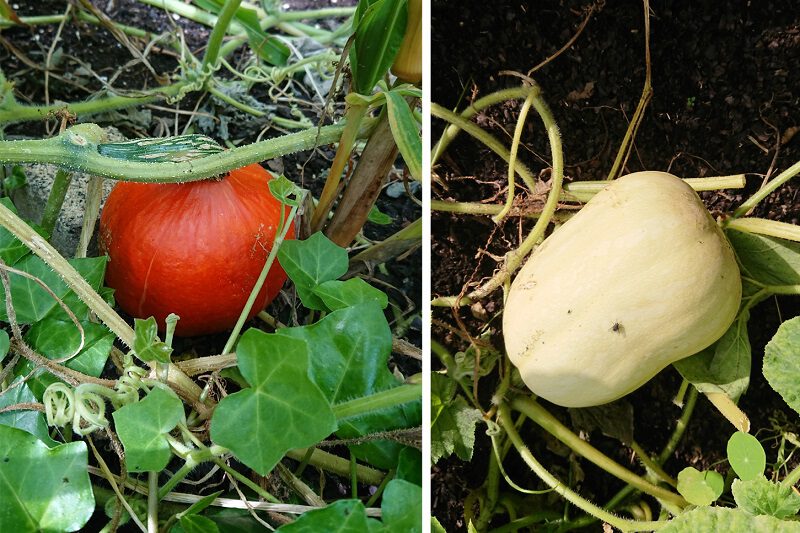 Je hebt ontzettend veel verschillende pompoenrassen en dus ook momenten om pompoen te oogsten. De Red Kuri (ras nr. 1 in mijn moestuin) is vaak wat eerder te oogsten en deze heb ik dan ook 2 weken geleden al geoogst uit de tuin. Ze lagen netjes op een steentje te rusten om zo niet beschimmeld te raken door aanraking met de grond. De Butternut pompoen (ras nr. 2 in mijn moestuin) is nog niet te oogsten. Hij moet nog even doorgroeien en nog wat kleuren. Er zijn vaak onduidelijkheden over wanneer je de pompoen precies kunt oogsten. Het is heel makkelijk eigenlijk, want als de steel waar de pompoen aan vastzit wat kurkachtig aan het worden is en deze van groen naar bruin/geel verkleurt, is de pompoen rijp en kun je hem oogsten. De pompoen is binnen op een koele plek zeker 3 maanden te bewaren.