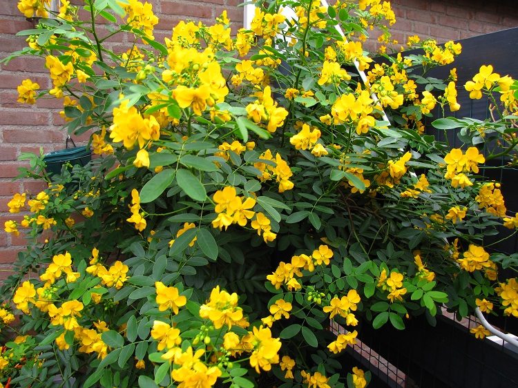 Als ik je trouwens ooit één succesvolle kuipplant aan kan raden, dan is het deze Cassia corymbosa (niet te verwarren met de Cassia didymobotrya die misschien wel mooier is maar minder lang bloeit en hier tot 2 keer toe de winter niet overleefde). De Cassia corymbosa op de foto heb ik al zeker 10 jaar, en elk jaar bloeit ze, van ongeveer mei (afhankelijk van het weer) tot in december (ook weer afhankelijk van het weer). Lang dus, heel erg lang. En rijk, zeer rijk. Even voor de duidelijkheid even een oude foto opgezocht: