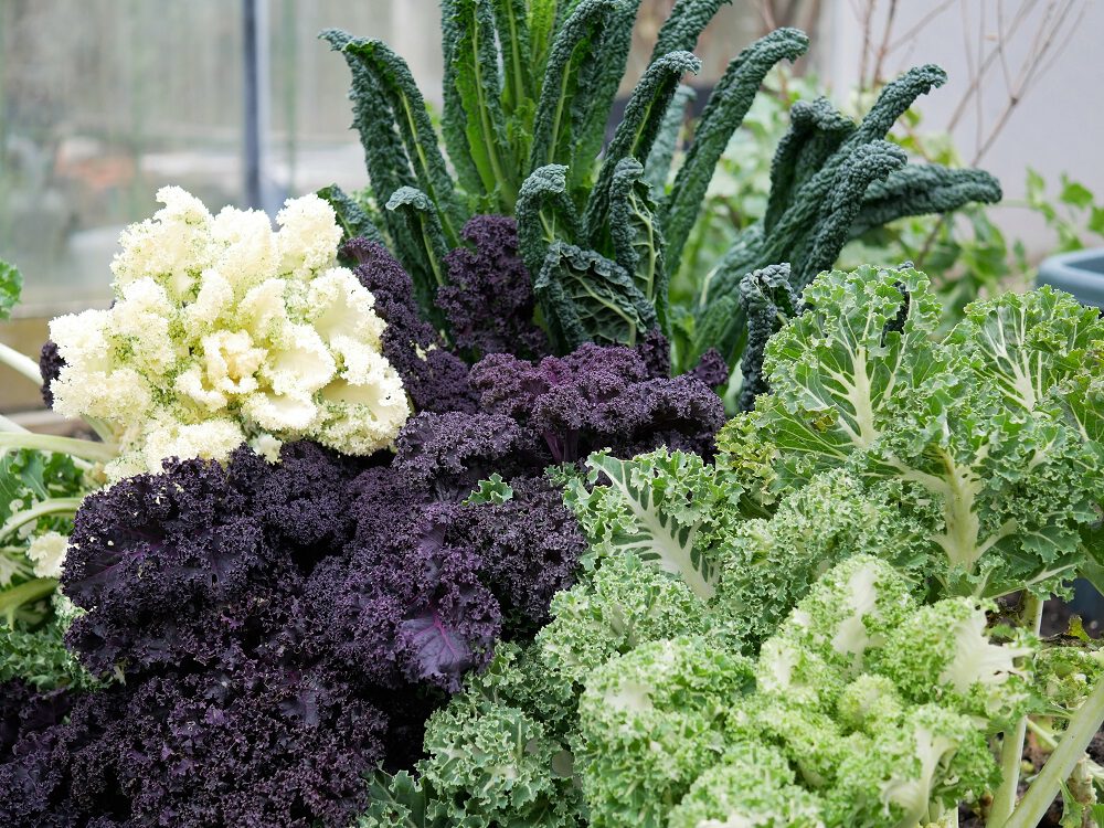 Palmkool is dus lekker, heeft een lange teelt en daardoor flinke oogst. Maar daarnaast is ze ook nog eens mooi. In de zomer is het bobbelige blad grijsgroen met een vleugje blauw erin. Hoe donkerder en kouder het wordt, des te donkerder wordt ook het blad; het is dan heel donkergroen met wat blauw. En daardoor is ze erg leuk te combineren met bijvoorbeeld andere groente, kruiden en bloemen in de tuin: het blauwgroene blad is in de zomer bijvoorbeeld een prachtige combinatie met fel gekleurde snijbiet, oranje Zinnia’s of juist met zachter gekleurde bloemen als Ageratum of crèmewitte afrikaantjes. In de herfst en winter is ze prachtig met andere kleuren kool (zoals op deze foto met paarse boerenkool en witte ‘kale Emerald Ice’):