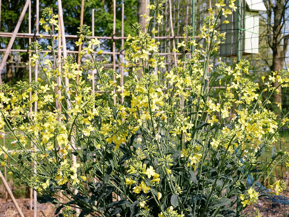 Maar laat vooral ook een aantal bloeistengels in bloei komen; de planten bloeien heel rijk, met vrolijke gele bloempjes. De planten worden in bloei heel groot, ruim 150 centimeter hoog en meer dan een meter breed. De bloempjes zijn eetbaar (ze hebben een poederige zachte koolsmaak). En ze lokken ook nog eens heel veel bestuivers, vooral hommels, en dat in april; een tijd dat er nog niet heel veel bestuivers zijn terwijl de fruitbomen en -struiken juist bloeien. En tot slot is het ook nog eens leuk om een voorjaarboeketje te plukken en wat bloemstelen in een vaas te zetten; op een koele terrastafel blijven ze wel een week mooi!