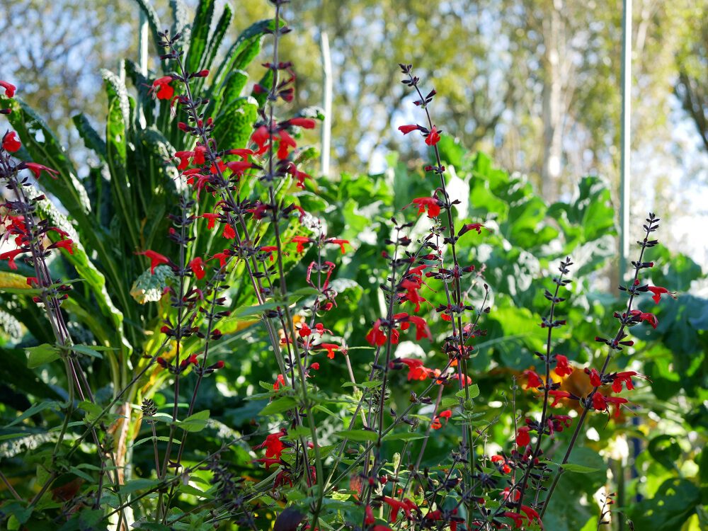 Palmkool in de herfst, samen met de roodbloeiende Salvia coccinea
