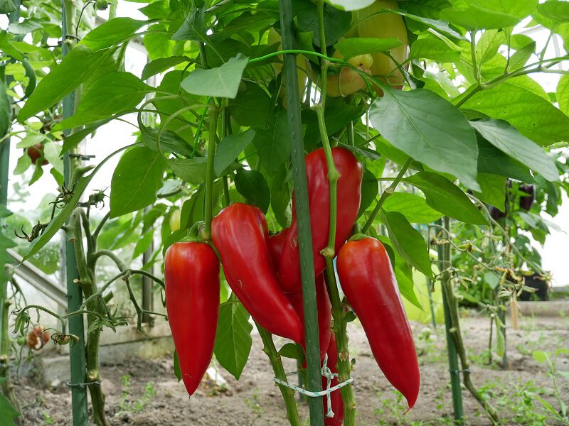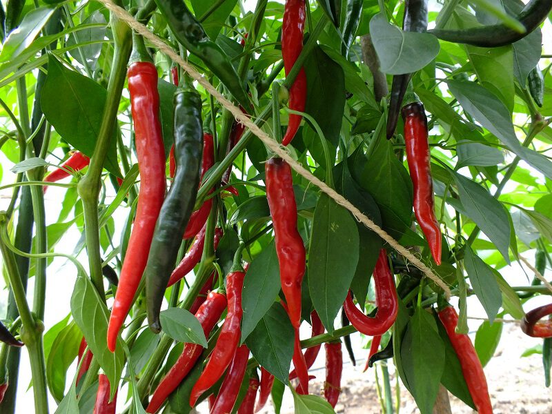 Op deze foto zie je peper Cayenne Ring of Fire. Er bestaan veel paprikarassen, deze geeft een vroeg een meer dan goede opbrengst van medium hete pepers die rijpen van groen naar fel rood.