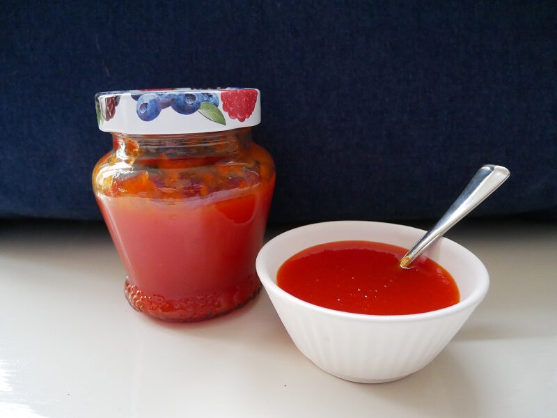 Tot slot dan nog een erg lekker inmaakrecept, van een zoete paprikagelei. Ja, een beetje raar misschien, maar wel lekker! De gelei heeft een zeer duidelijke paprikasmaak. Wij vinden het misschien iets minder lekker op een plakje briochebrood of cracker maar dat komt omdat we een paprika toch associëren met een hartig gerecht. Misschien moeten we proberen dat eens los te laten. Maar voor nu vinden we de zoete paprikagelei vooral heerlijk op een broodje met bijvoorbeeld sla en kipfilet, of rucola en oude kaas, in een saladedressing en vooral helemaal heerlijk bij een kaasplankje. Denk qua smaak een beetje aan chilisaus zonder pittigheid en extra veel paprikasmaak.