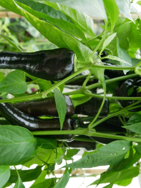 Op deze foto zie je paprika Marconi Purple, de paprika’s rijpen van een diepdonkerpaars, bijna lakzwart, naar donkerrood.
