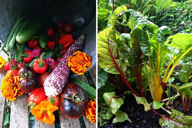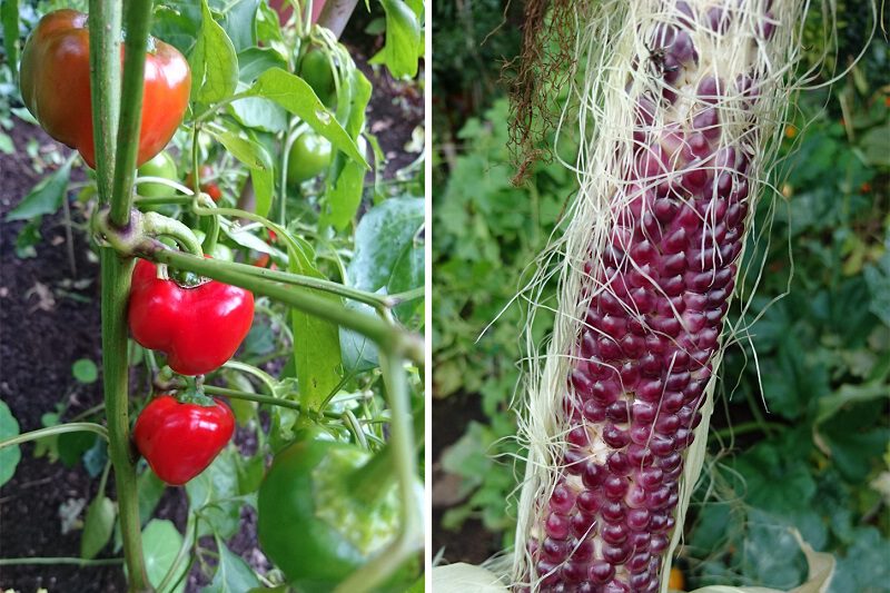 Naast de bloemen en de kruiden die je kunt vinden in mijn tuin, valt er gelukkig ook nog wel wat te oogsten. Ik ben blij dat het nog niet zo koud is geworden dat alles het begeven heeft. Zo heb ik nog veel tomaten, paprika’s en boontjes hangen. De maïs staat er bij mij ook nog steeds. Veel kolven heb ik al geoogst maar ik laat de laatste planten expres nog even staan. Ik kan niet iedere dag maïs eten en maïs is echt het lekkerste als je het vers bereidt.