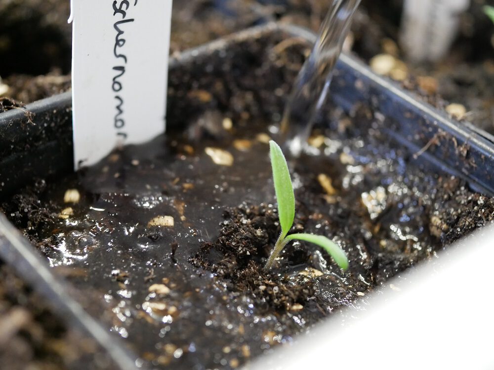 Tomatenzaailingen houden van vochtige, maar niet natte grond. Geef voorzichtig water met een plantenspuit of een gieter met een fijne broes. Te veel water kan ervoor zorgen dat de wortels doodgaan. Laat de bovenste laag grond licht opdrogen voordat je opnieuw water geeft.