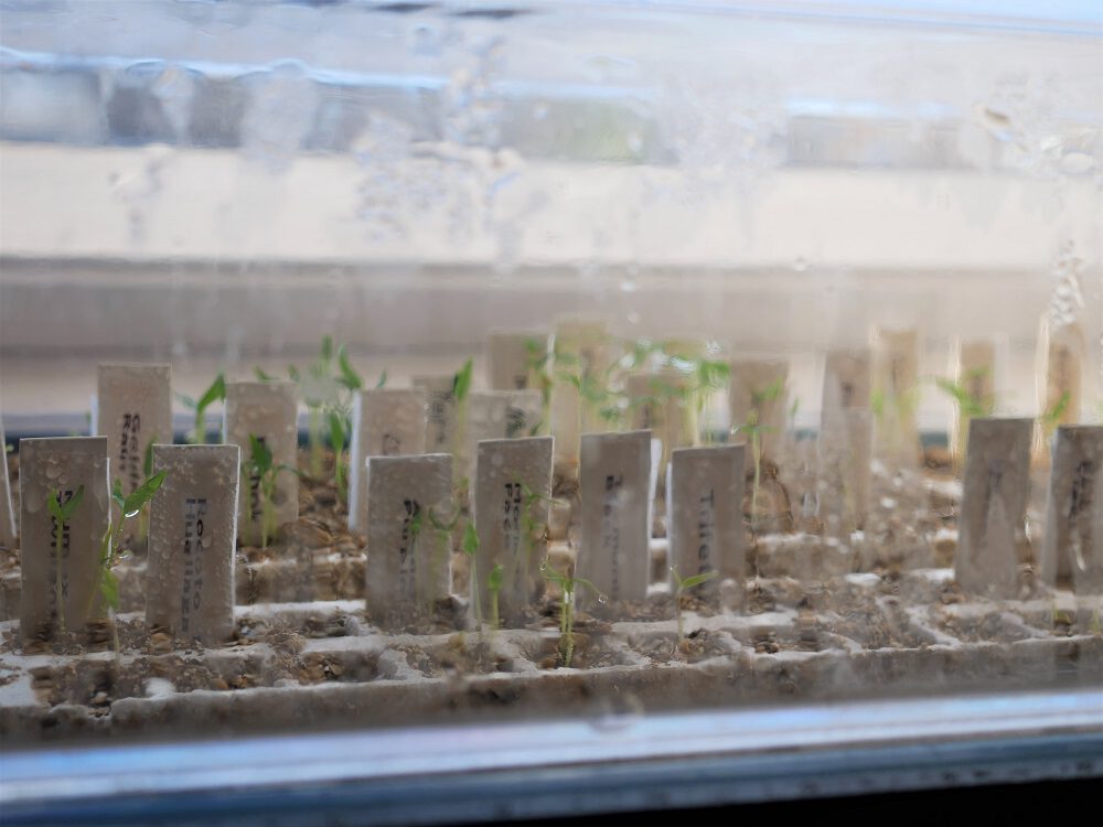 Op de foto zie je dat een groot deel van de zaailingen goed is gekiemd. Dat wat nog niet is gekiemd blijft gewoon nog een tijdje in de tray met vermiculiet in de propagator staan en haal ik er later uit.