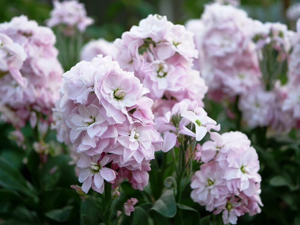 Matthiola incana Appleblossom. Sommige Matthiola’s kunnen wat hoger worden, maar worden in onze kleigrond dan vaak wat slordig, ze groeien soms scheef en vallen soms zelfs om. Maar deze Appleblossom is en blijft laag en compact, niet hoger dan 25 centimeter. Dit jaar staan de planten in een verhoogde bak in de voortuin, en daar doet ze het ook meer dan prima in; bloeit al vanaf begin juni en die bloei gaat nog wel enige weken door. De kleur hangt ergens tussen appelbloesemroze en zacht lila in.