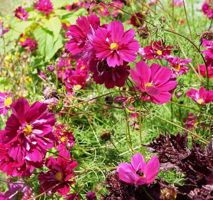 - en tot slot; er bestaan enorme veel soorten en rassen van eenjarigen; van hoog tot laag, kleinbloemig, grootbloemig, enkelbloemig, extra gevuld, in alle mogelijke kleuren, van wit tot knalrood en pimpelpaars, hommellokkers, motjeslokkers, bijenlokkers, vliegenlokkers, geurend en niet geurend, eetbaar en niet eetbaar en zelfs giftig, je kunt het zo gek niet bedenken of je kunt het tussen eenjarigen vinden.