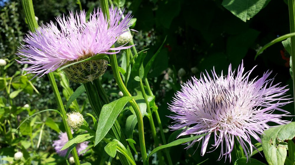 Een voorbeeld van een erg mooie eenjarige met een matige naam is deze Centaurea americana ‘Lilac’ (want dat ze lila is kan ik wel zien). Dat neemt niet weg dat ze op haar naam na geweldig is: ze bloeit lang en rijk, de planten worden groot (ruim 150 centimeter hoog), de knoppen zijn prachtige kantwerkjes. De bloemen zijn ook heel groot (ruim 8 centimeter), en ze trekt veel bestuivers.