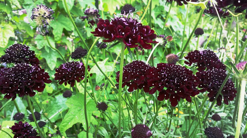 Scabiosa atropurpurea Black Knight. Prachtige, fluwelige, bijna zwarte bloemen, best groot ook (3,5 tot 4 centimeter), zeer rijk bloeiend, en trekt heel veel hommels.