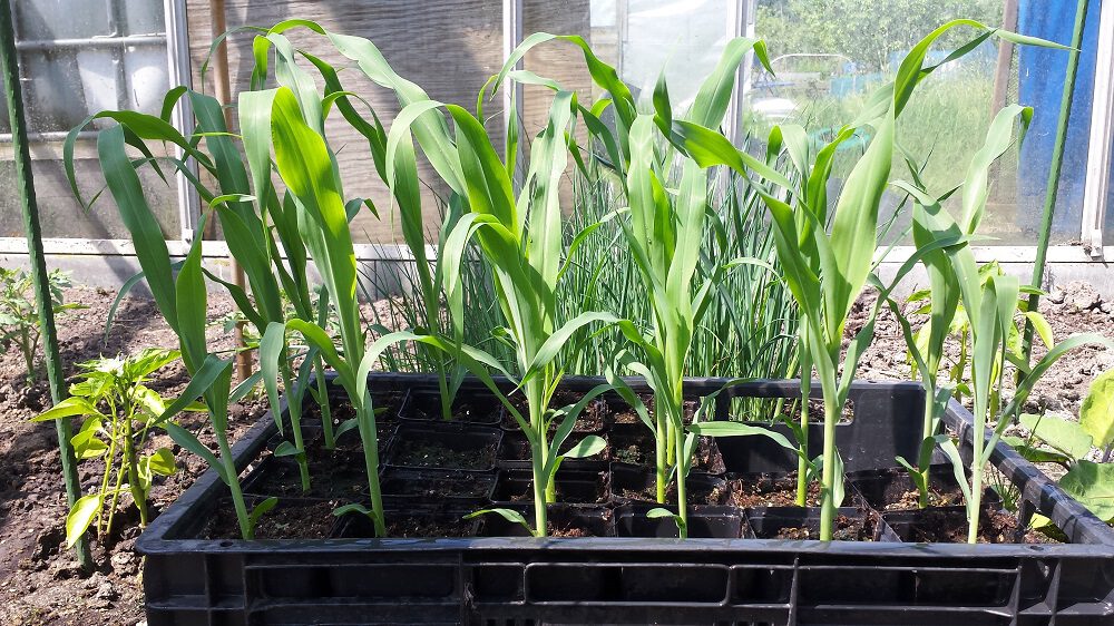 Op deze ook weer oudere foto (want ik ga dus pas half april zaaien) zie je maïszaailingen op 13 mei, ook weer goed getimed, grote en sterke planten die kunnen worden uitgeplant.