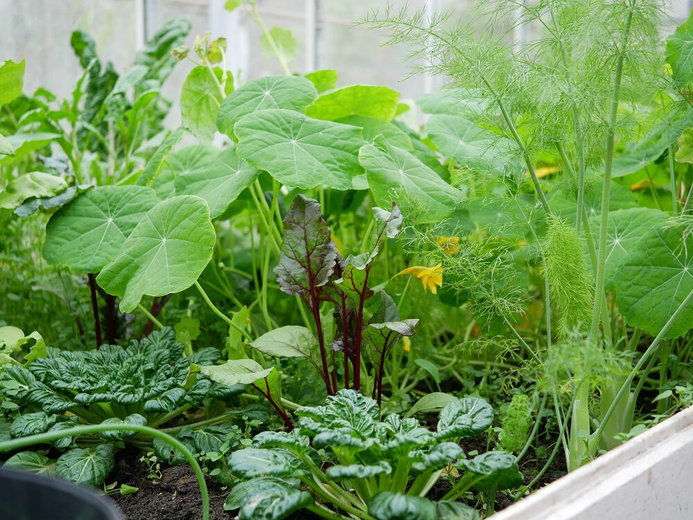 In een andere kas staan weer wat andere soorten. Voor de vrolijkheid heb ik er wat goudsbloemen (zoals de bloem op de foto bovenaan dit artikel) staan die nu zelfs nog bloeien en Oost-Indische kers, waarvan we ook de blaadjes en bloemen kunnen oogsten en eten. Ook staan er winteruien, rucola, wat bietjes, tatsoi en restjes die ik in de andere kas niet kwijt kon.